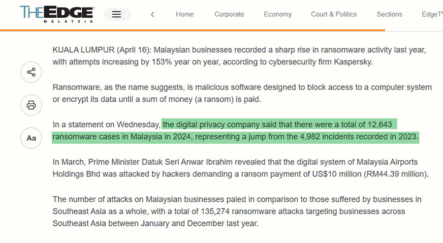 In Malaysia, the threat is growing at a rapid pace. The Edge Malaysia reported 12,643 ransomware cases in 2024, up from 4,982 cases in 2023, a 153% year-on-year increase. The impact spans industries, from manufacturing and hospitality to education and public infrastructure.
